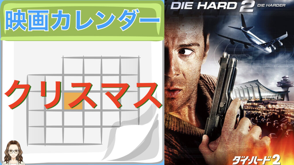 【映画カレンダー】この記事では日付にちなんだ映画を紹介しています。 12月25日にちなんだ映画は、シリーズ第2弾。 またしてもクリスマスに事件に巻き込まれてしまった主人公ジョン・マクレーンの物語『ダイ・ハード2』です。 -