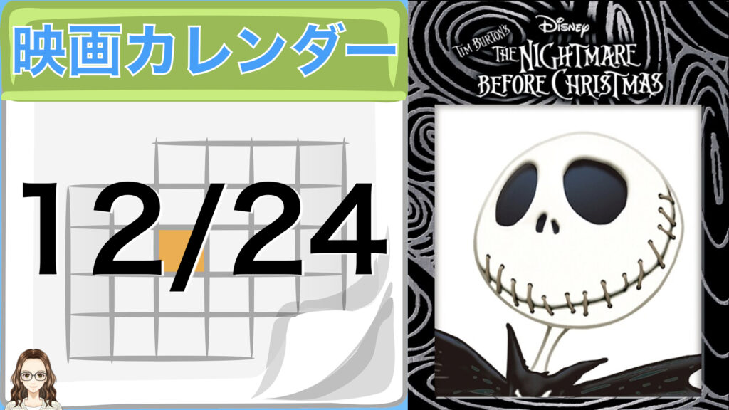 【映画カレンダー】この記事では日付にちなんだ映画を紹介しています。 12月24日にちなんだ映画は、ティム・バートン監督が書いた詩をもとにして作られたストップモーション・アニメ『ナイトメアー・ビフォア・クリスマス』です。 -