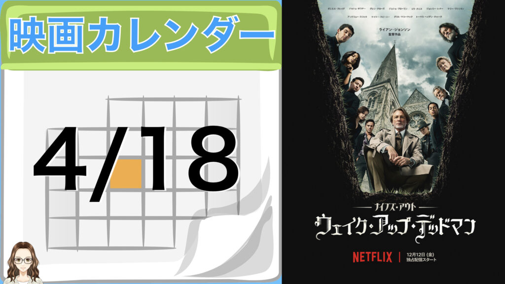 【映画カレンダー】この記事では日付にちなんだ映画を紹介しています。 4月18日にまつわる作品は、ダニエル・クレイグが主人公の探偵を演じた「ナイブズ・アウト」シリーズ3作目『ナイブズ・アウト: ウェイク・アップ・デッドマン』です。 -